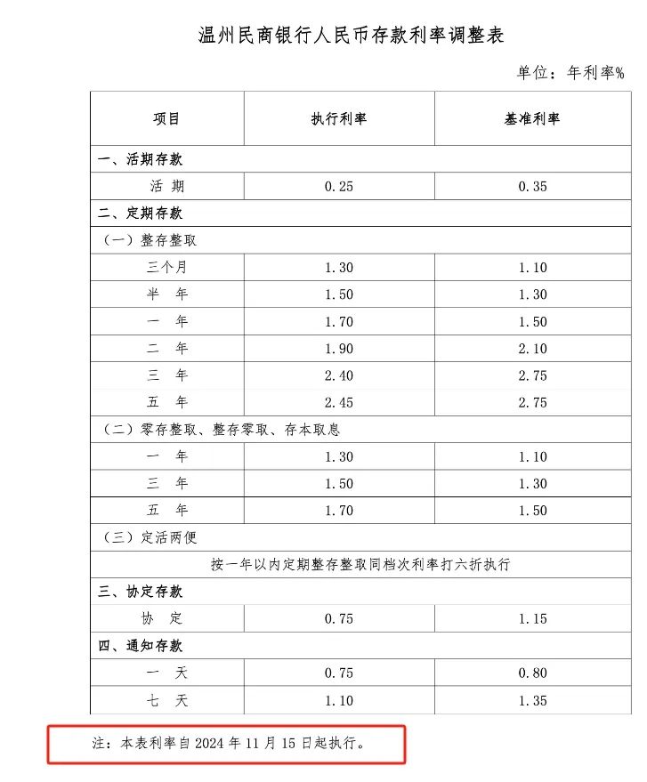 温州民商银行的三年期和五年期整存整取年化利率分别降至2.4%和2.45%。