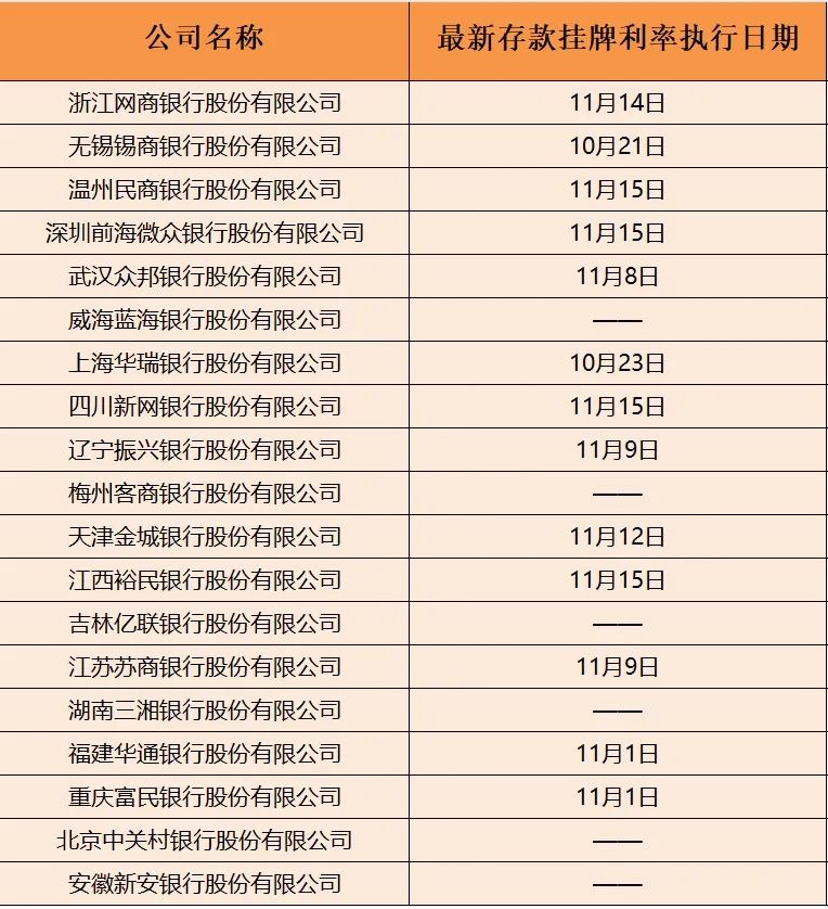 多家民营银行昨日同步下调存款利率。江西裕民银行、微众银行、新网银行、温州民商银行等四家民营银行今日在官网公布,自11月15日起执行新的人民币存款利率表。