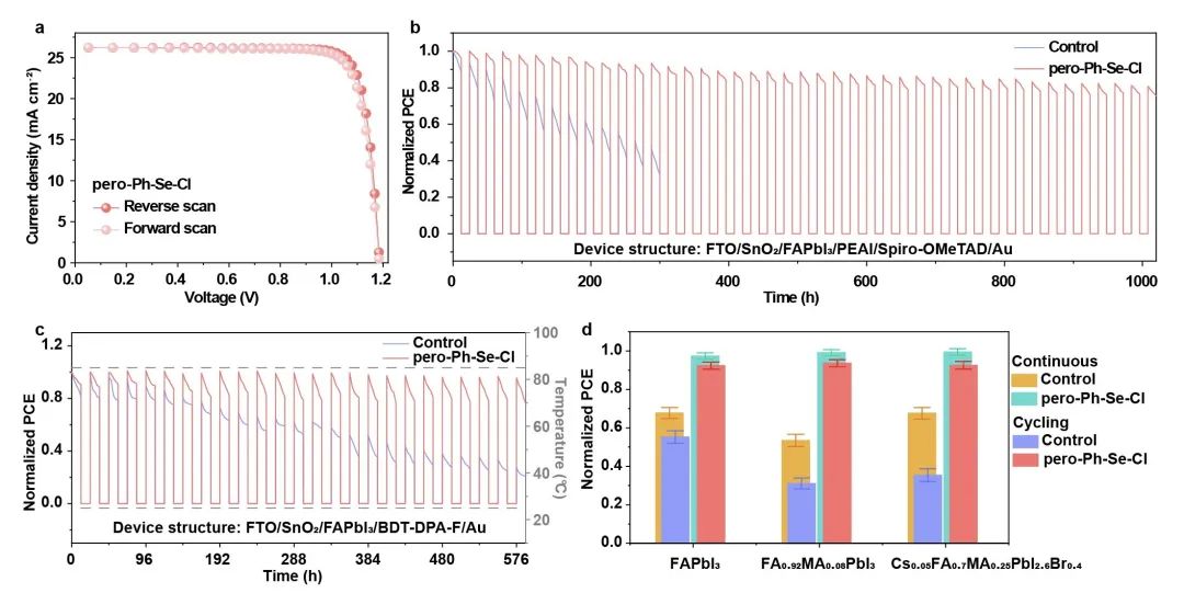 图1 钙钛矿太阳能电池在连续光照和昼夜循环工作模式下的降解机制示意图基于上述研究,李耀文教授团队设计合成了一系列配体材料来消除晶格应力变化、稳定钙钛矿晶格。其中,苯基氯化硒(Ph-Se-Cl)展现了独特的作用,Ph-Se-Cl在热退火过程中和有机阳离子盐反应形成易挥发物质,优化了钙钛矿的晶体生长动力学,获得了对称性更高、室温稳定的钙钛矿晶格。此外,Ph-Se-Cl和碘化铅反应生成含硒铅酸盐并锚定在晶界处,进一步抑制了光、热诱导的晶格膨胀收缩,消除了晶格应力变化。最终,基于Ph-Se-Cl制备的钙钛矿太阳能电池认证效率高达26.32%。同时,在昼夜循环模式下,器件的T80寿命(器件效率衰减至初始效率的80%所需的时间)显著提高了10倍,基于其它ISOS协议测试的器件稳定性均得到大幅提升(图2)。该工作揭示了在昼夜循环工作模式下钙钛矿太阳能电池独特的降解机制,并强调了稳定晶格以增强电池实际工作寿命的必要性。此外,该工作还指出,针对具有软晶格特性的钙钛矿太阳能电池建立实际应用中的寿命评估方法的重要性,将加速其商业化进程。