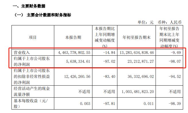 而在今年前三季度,杉杉股份的营收约为132.84亿元,同比下降9.69%;净利润约为2321万元,同比下降98.07%。