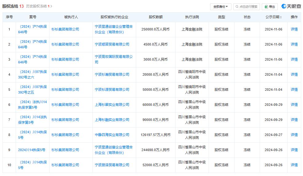 不仅如此,天眼查APP显示,今年以来,杉杉集团、杉杉控股有限公司等杉杉系企业多次被列为被执行人,其持有的股权多次遭到司法冻结。