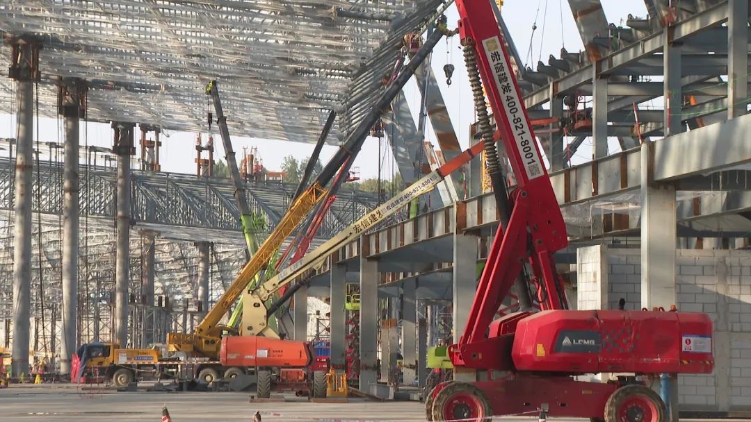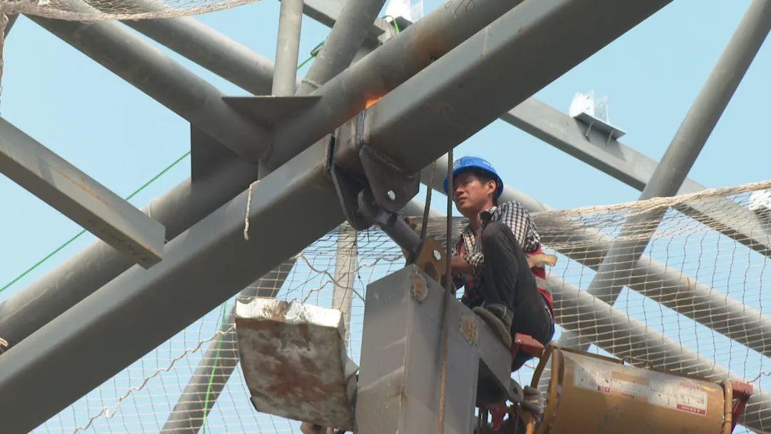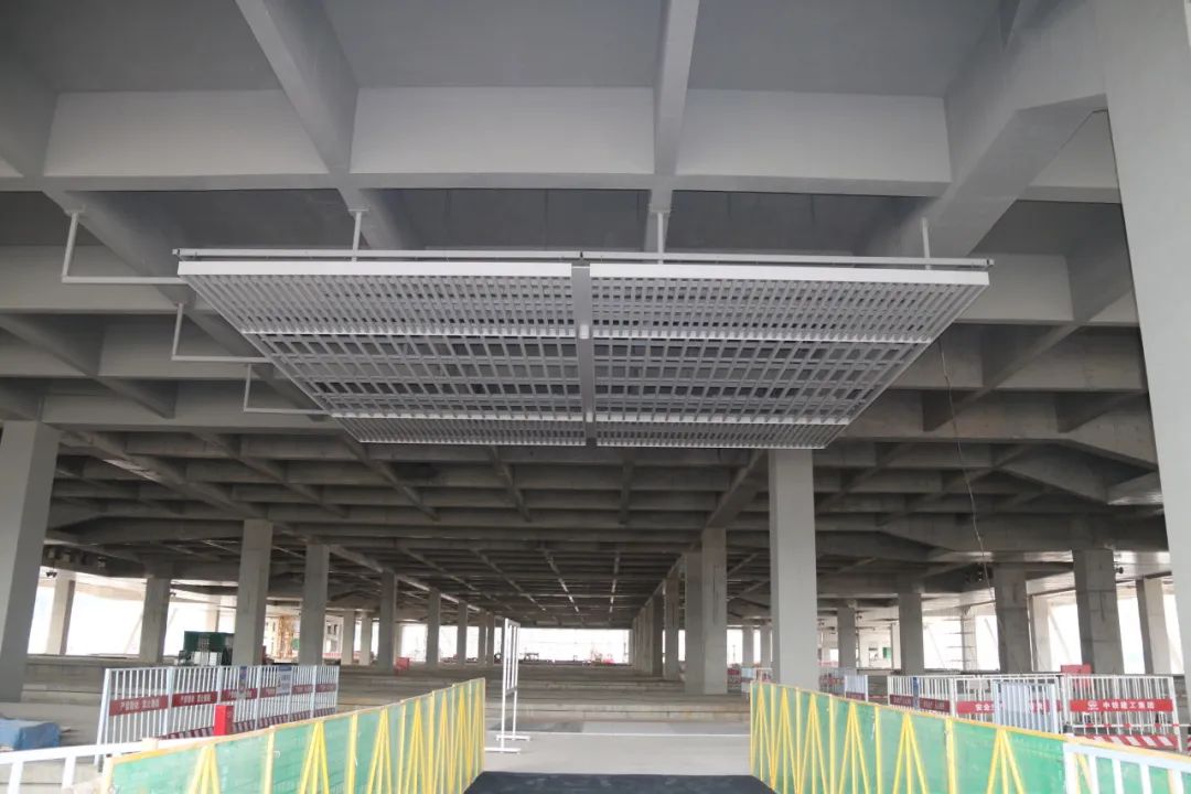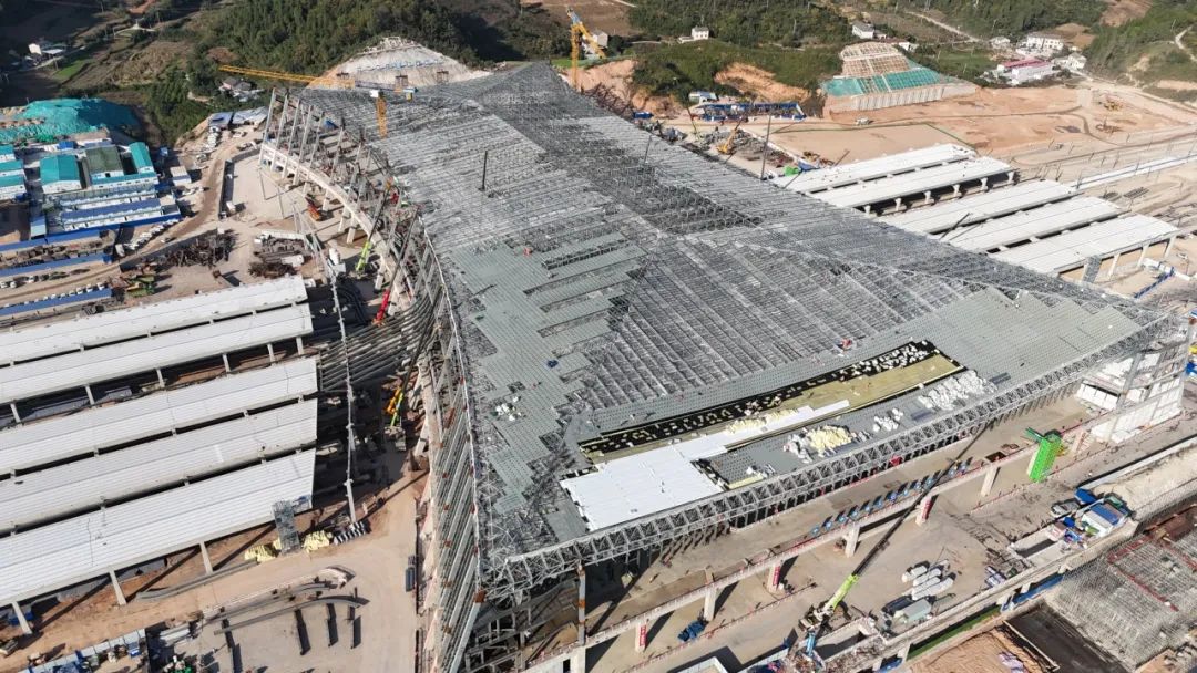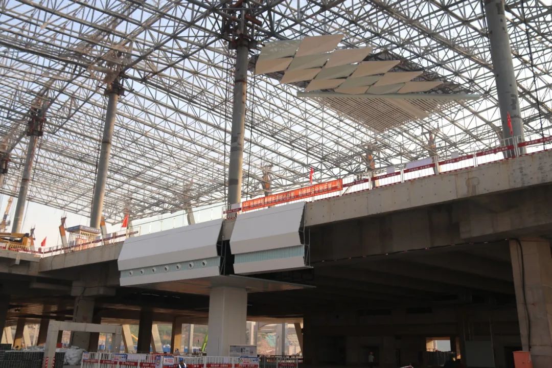 宜昌北站站房超5500吨屋盖桁架已封顶,目前金属屋面、玻璃幕墙和室内装饰装修、机电安装等正同步展开施工。站房A区金属屋面已完成60%。