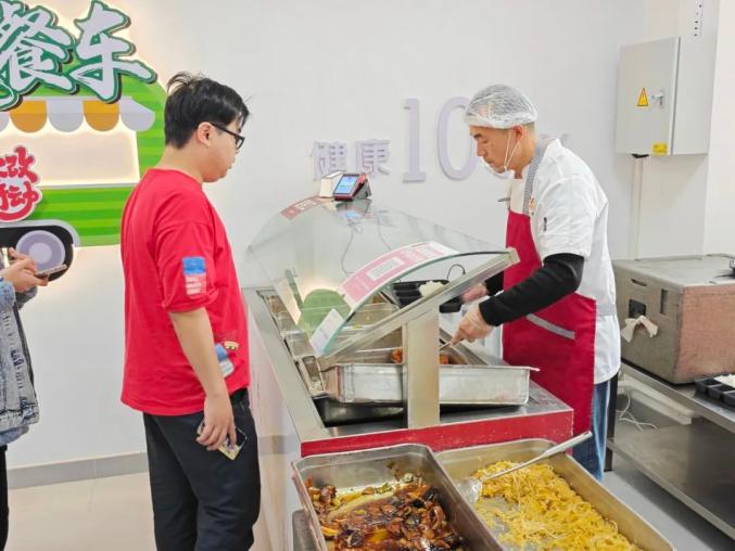 学生在暖廊里的“功夫餐车”售餐点打饭