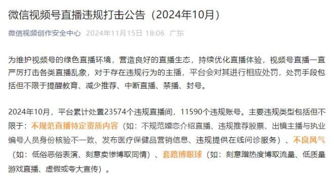 日前,“微信视频创作安全中心”微信公众号发布《微信视频号直播违规打击公告(2024年10月)》。公告显示,10月,微信平台累计处置23574个违规直播间,11590个违规账号。