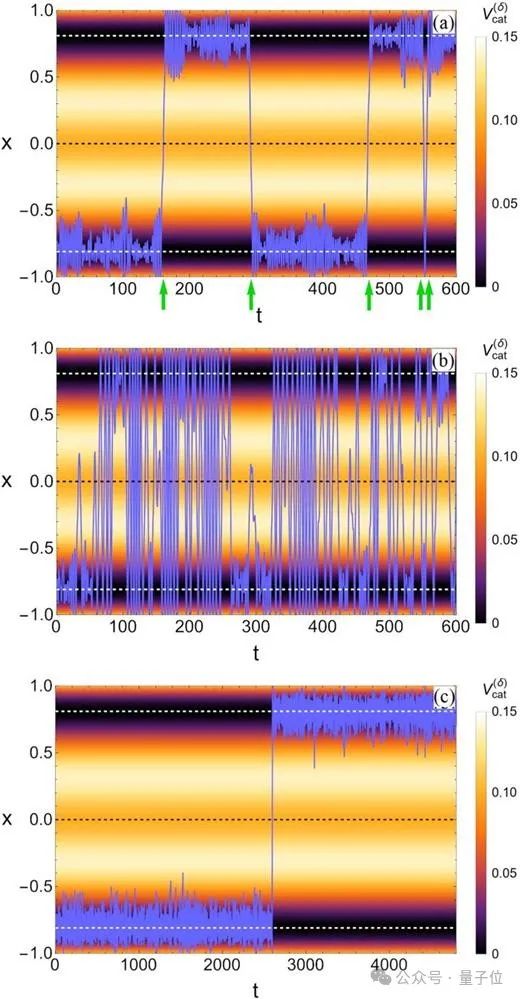 (a)显示猫可能突然从一个平衡点跑到另一个平衡点,在那里停留一段时间,然后再次随机地回到上一个平衡点。(b)为小猫(c)为老年猫对于第7种行为,作者定义呼噜声是一种稳定机制。
