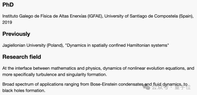 他主要研究非线性演化方程的动态行为,特别关注奇异点的形成、长期动态行为和湍流问题,这在流体动力学、玻色-爱因斯坦凝聚态和广义相对论等领域具有广泛应用。Anxo此前通过巴黎高等师范学院物理系的La Caixa青年领袖计划,加入了加利西亚高能物理研究所(IGFAE)。