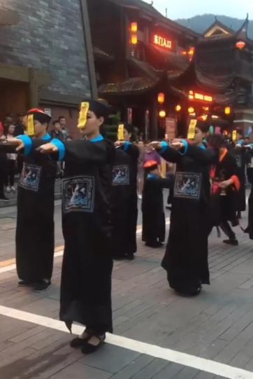 类似的,还有湖南的“赶尸秀”,一群打扮成恐怖片中“僵尸”样子的男子穿着古装衣服蹦来蹦去,被网友评价为“可以接地气,但不能接地府”。