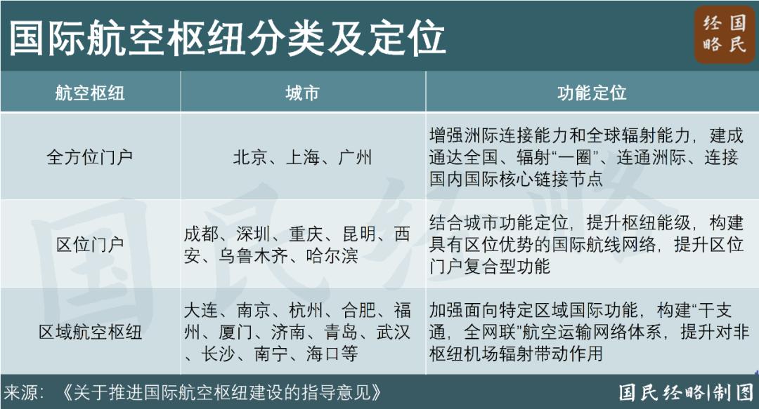其中,北京、上海、广州为第一梯队,被定位为全方位复合型国际航空枢纽,深圳、成都、重庆等7城位居第二梯队,为区位国际航空枢纽。