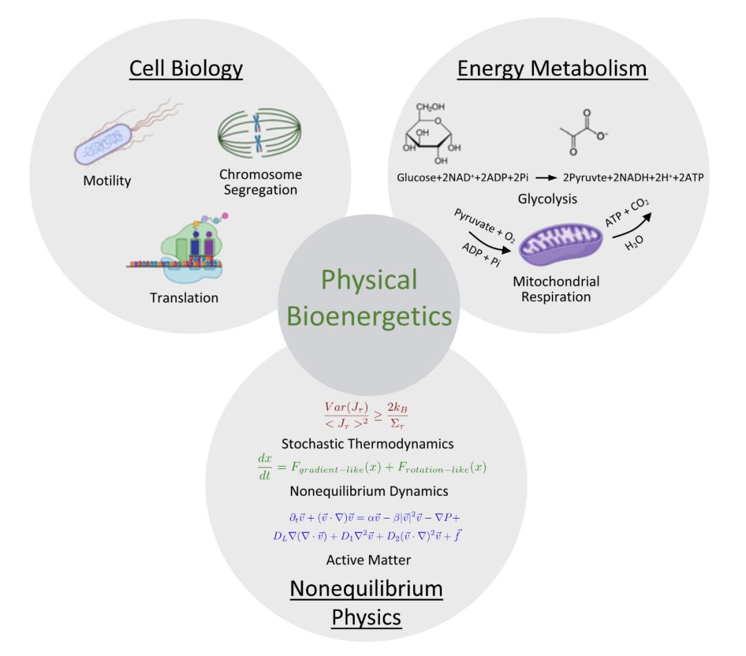图1. 物理生物能量学位于细胞生物学、能量代谢和非平衡物理学的交界,旨在揭示细胞中的能量成本和约束。它结合了来自每个领域的已有知识,以了解细胞使用多少能量、它们如何将这些能量分配到不同的细胞过程中,以及相关的能量限制。