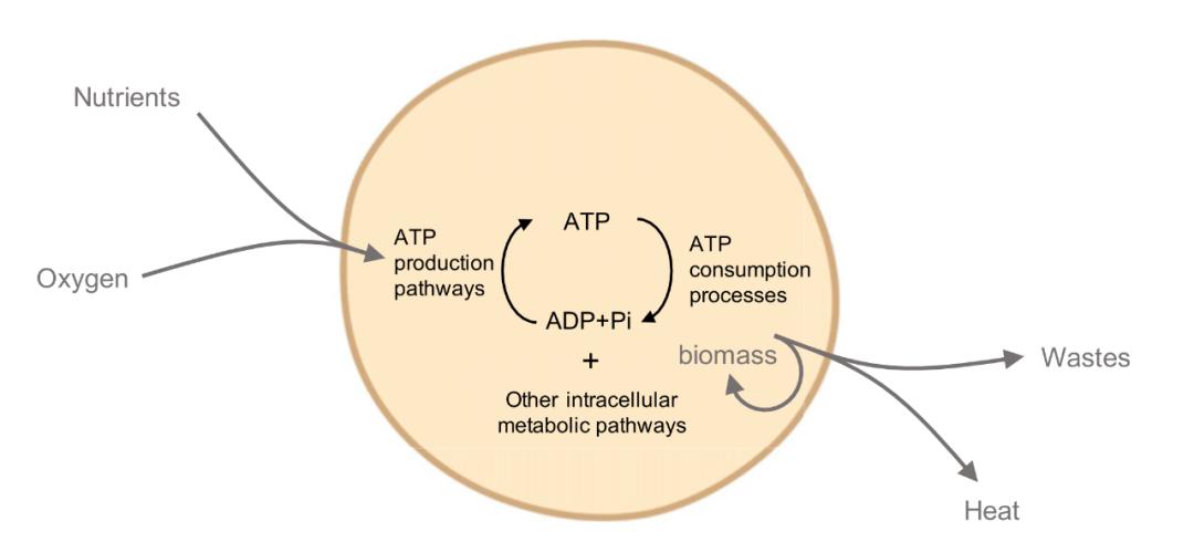图2. 典型的细胞化学和能量通货示意图。能量通货代表来自环境的吉布斯能的转化率,例如从营养物质,通过细胞活动到废物、生物质或热量。灰色箭头表示通过单元的全局能量通货。整体能量通货的焓部分可以用细胞的产热率来衡量。对于有氧生物,OCR的测量可以通过桑顿规则[46]与产热率相关联。细胞内能量通货由通过特定代谢途径的通量表示,例如产生和消耗ATP的那些。