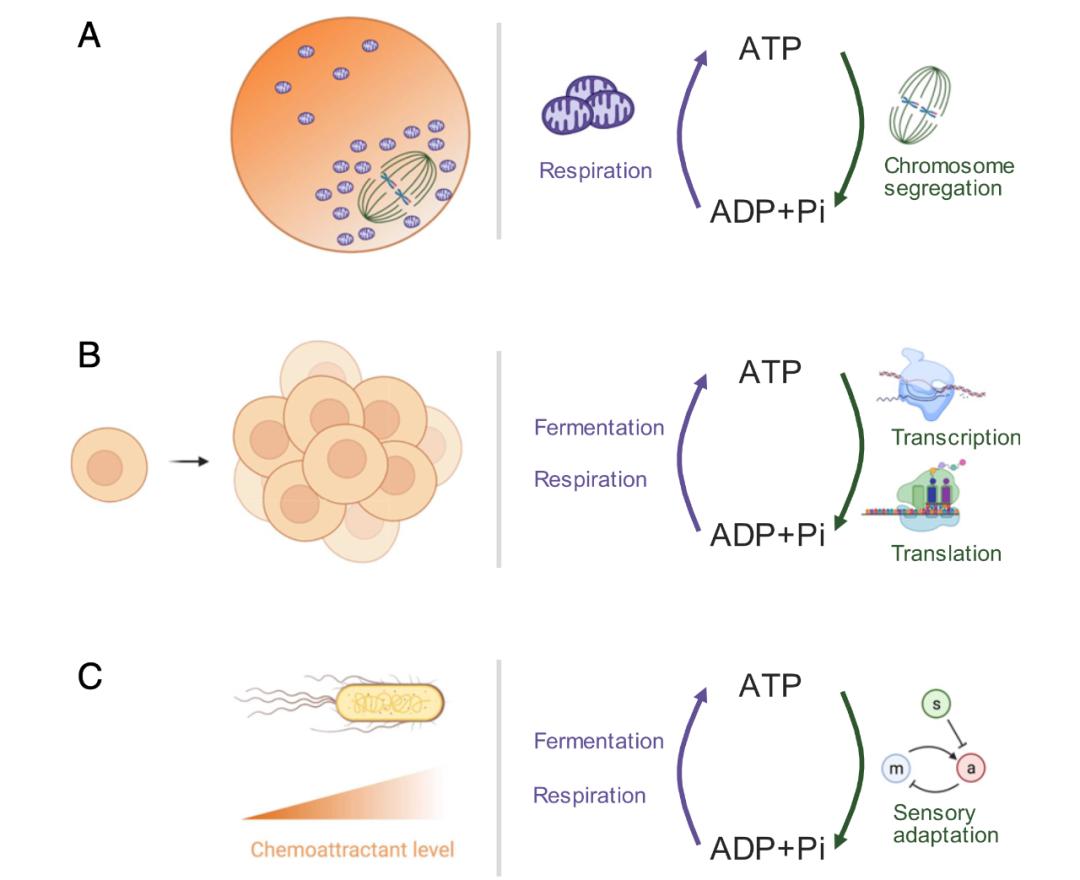 图3.有助于细胞能量收支的细胞过程示例。(A)哺乳动物卵母细胞中的纺锤体自组织和染色体分离。(B)在生长细胞中具有转录和翻译的蛋白质合成。(C)趋化性大肠杆菌中的感官适应,a和m分别代表自适应反馈网络中的输入、输出和控制器[10]。