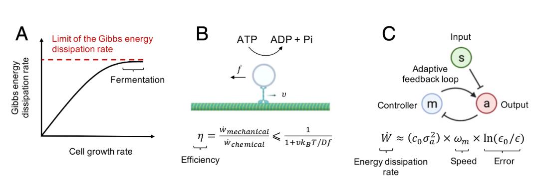细胞过程由吉布斯能的耗散提供动力,能量耗散率可以对细胞过程施加限制。这些限制体现在细胞生长速率的限制[4](图4A)、分子马达的效率[5-7](图4B)以及细胞信息处理速度和准确性之间的权衡[8–10](图4C)。在本节中,研究人员将详细讨论这些示例,并演示如何应用非平衡物理学中的工具来理解能量约束。