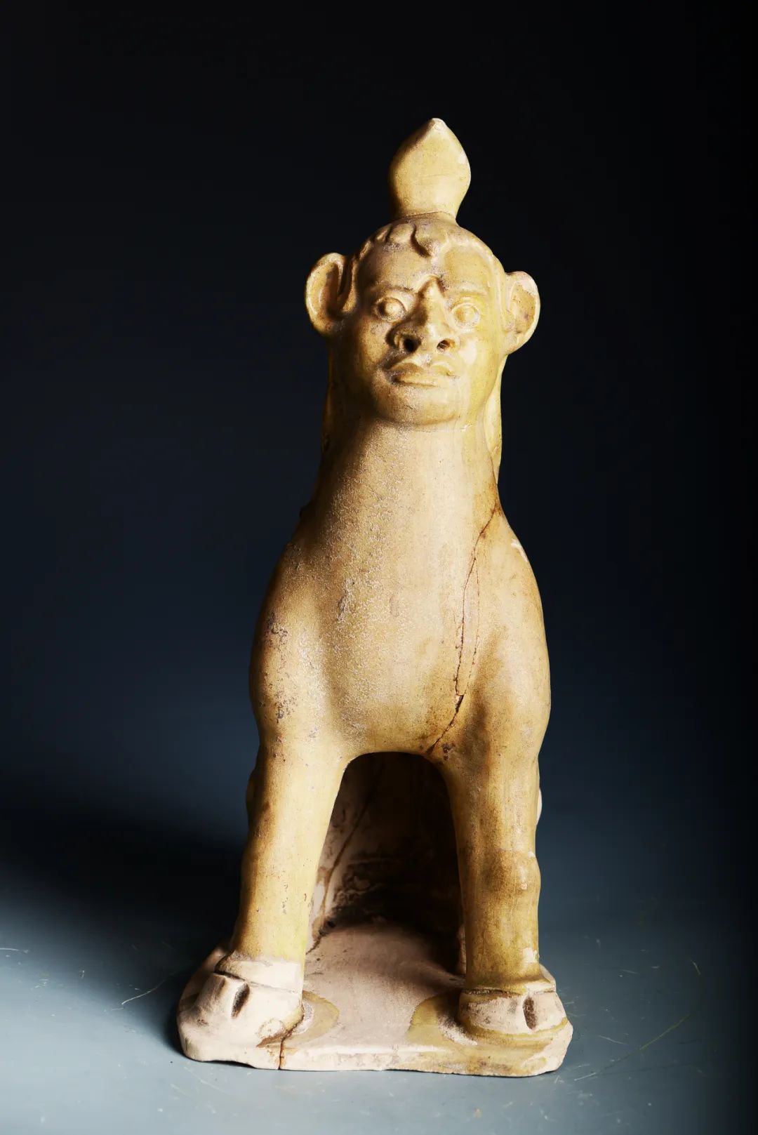 镇墓兽最早见于战国楚墓,流行于魏晋隋唐时期,五代以后逐步消失。早期镇墓兽的材质为木质,隋唐时以陶质为主。此次“撞脸”的镇墓兽,是一只耀州窑的镇墓兽。该镇墓兽胎呈灰白色,通体施黄釉、近底部无釉。人面兽身,额发上扰,头顶高耸犄角,双耳巨大向外伸张,双耳后单绺鬃毛垂至肩部,怒目圆睁、目光如炬,眉檐凸起,宽鼻突出,阔嘴微闭,背部角脊相连、脊呈火焰状,马蹄形足,前肢斜立、后肢蜷曲,蹲坐于不规则台座之上。