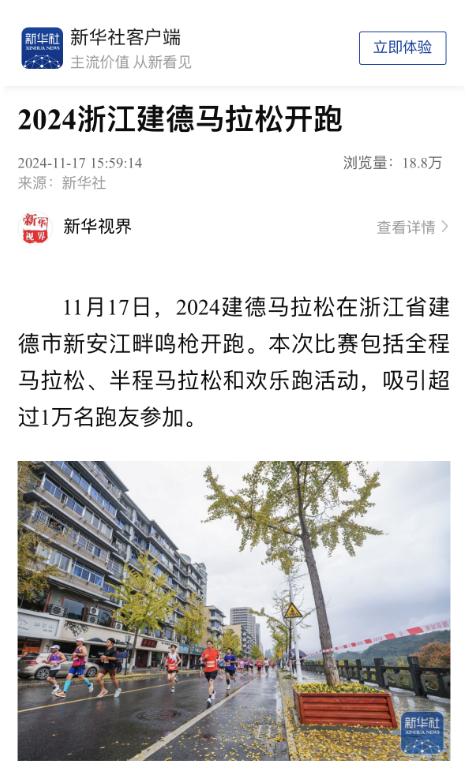 新华社客户端、《浙江日报》《杭州日报》聚焦2024建德马拉松,作为浙江省内的品牌路跑赛事,本次马拉松将更多的山水风光融入赛道,释放“跟着赛事去旅行”的体育经济新业态。