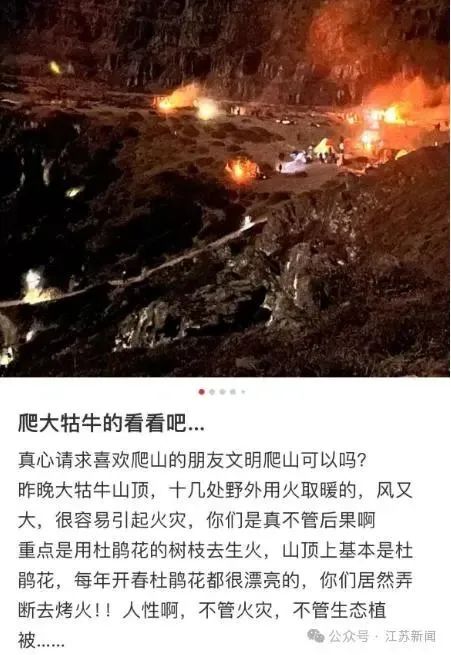据媒体报道,自2023年起,东川大牯牛山日出云海在社交平台上刷屏后,吸引众多游客前往此地看日出,后发展为一野生“景区”。近期,大牯牛山的日出美景再次走红网络,为了观日出,不少人选择通宵夜爬。夜间气温低,山顶风大,为了避寒,有人便萌生出烧山的“邪念”。在社交平台上,不少网友对此行为进行了谴责。