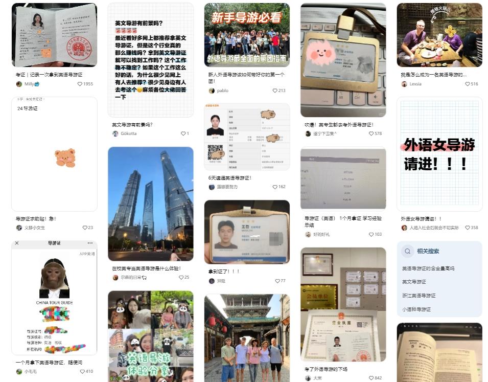 社交媒体平台上,关于英语导游证的讨论不少。(图/网页截图)许多语言类学生开始认真思考考取导游证的可行性:导游资格证终生有效,但能否找到旅行社或协会挂靠,最终拿到导游证开始带团还是要看个人能力。话虽如此,在就业形势对应届生来说还不够明朗的时候,一个到手的资格证,也代表着一种职业选择的可能性。