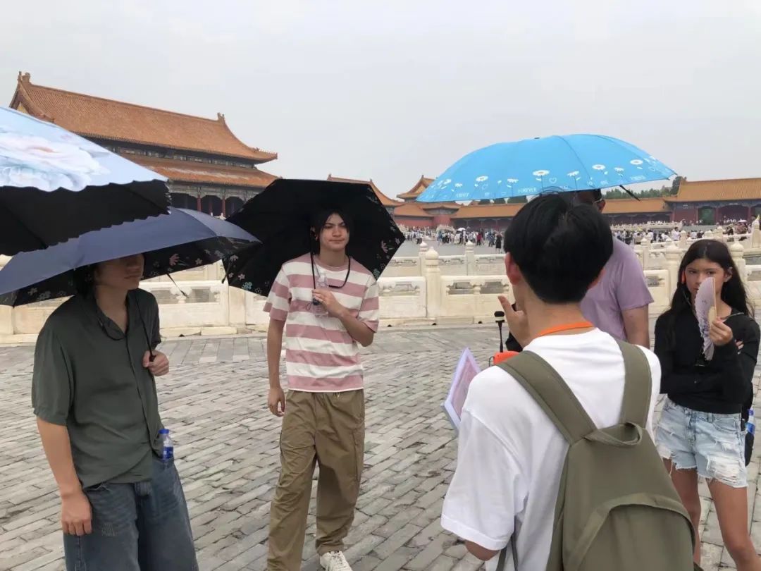 阿莱在故宫接待外国游客。(图/受访者供图)阿莱本科学的是法语专业,但英语底子也很好,他发现英语导游考试的面试难度低于中文面试:“比如,杭州的中文导游面试时要背13个景点的导游词,而英文考试只需要背5个。”作为文科生,不少考试内容阿莱以前就有涉猎,只需稍加回忆背诵,就能上考场。