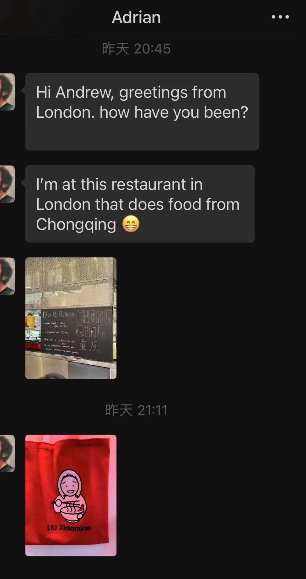 Andrew曾经的客户回到英国后,仍然愿意尝试小面,还进一步分享了他未来的中国旅行计划。(图/受访者供图)而作为外语导游,除了讲解好每一个景点,自己能输出的更多是“中国人到底怎么生活”的信息。Andrew相信,让外国游客与一个中国人、与中国人文特色产生深度联系,或许能改变一部分人心中被刻板印象和错误的媒体报道影响的中国形象。