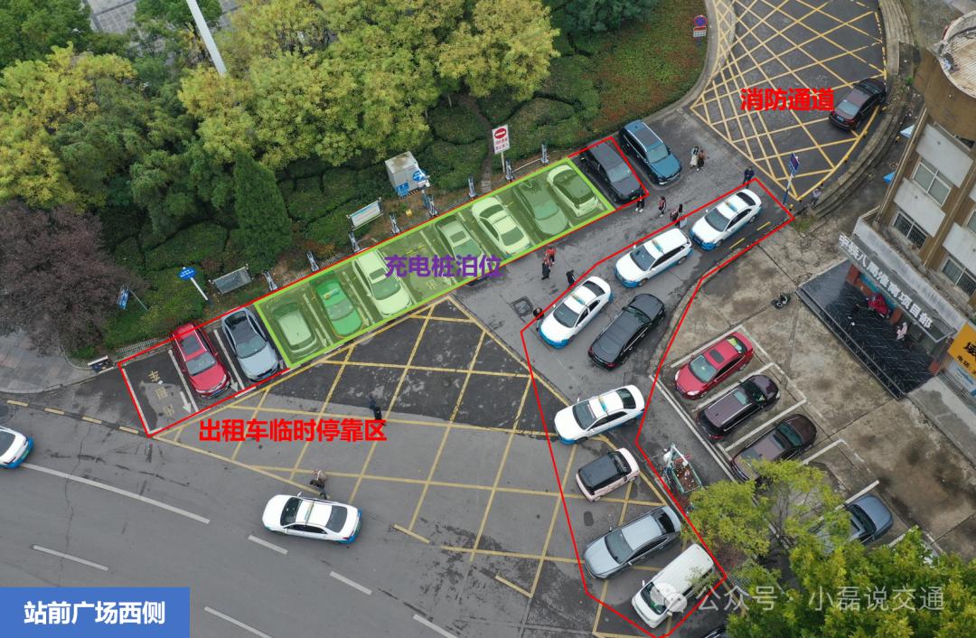为使乘客出行及出租车停车更方便、更安全,同时解决车辆乱停乱放、燃油车占据充电桩泊位的问题。市公安局交警支队联合淮南建发智慧泊车管理有限公司对淮南站出租车临时停靠点进行重新规划,在站前广场离出站口最近的位置施划两排共20个泊位,包含17个出租车临时停车位和3个执勤车位,两排车位间隔5m,单个泊位宽2.5m,方便车辆进出及上下客。同时协调建发智泊公司将站前广场停车场免费时段由30分钟增加至1小时。