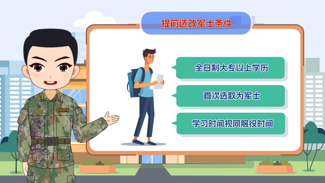提前选改军士条件:根据《军士职业教育发展管理暂行规定》,义务兵服现役满1年,具备《军士暂行条例》规定的军士基本条件且符合以下条件可优先提前选改军士:
