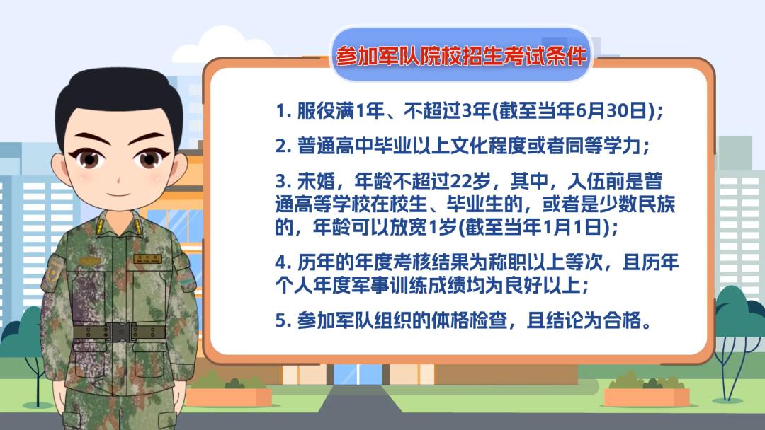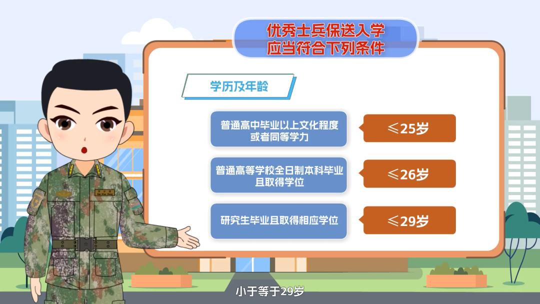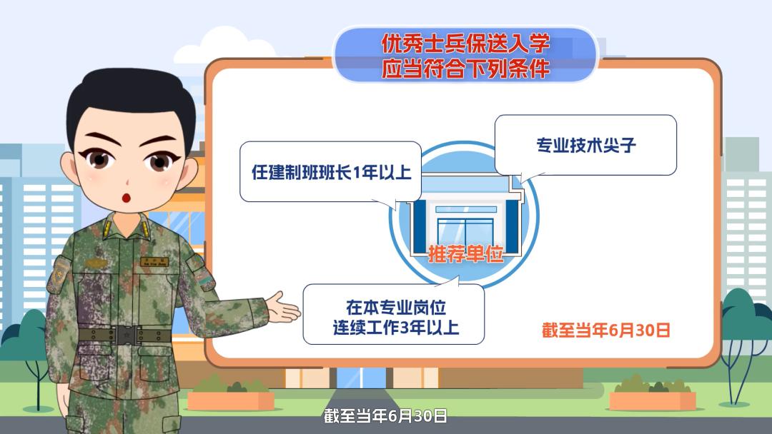 四、优秀士兵保送入学:普通高中毕业以上文化程度或者同等学力的义务兵有机会保送军校。