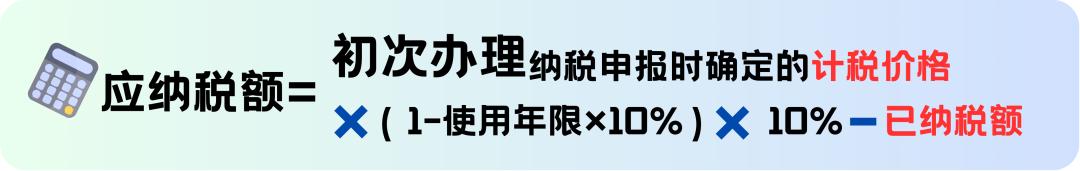 的计税价格×(1-使用年限×10%)×10%-已纳税额。应纳税额不得为负数。