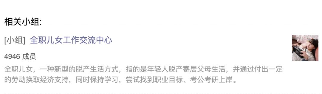 豆瓣“全职儿女工作交流小组”已经有近5000名成员,百度“啃老族吧”也有3.2万人关注,累计发送了25.7万条帖子。
