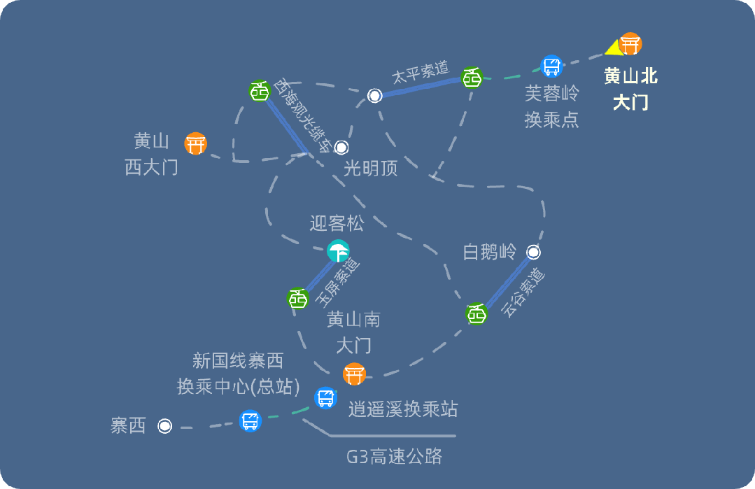 北门入线路推荐一日游:黄山北大门入→太平索道上行→排云亭→飞来石→光明顶→百步云梯→迎客松→玉屏索道下行