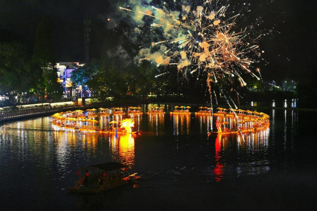 齐云山致力于成为大黄山夜游新地标,打造“白岳夜逍遥”夜游IP,以诸多文化活动让游客停下来、住下来,齐云打铁花、炭花舞、喷火等非遗演绎在齐云山的夜色中大放异彩,更创新打造横江舞金龙产品,丰富了山水间的夜游体验。