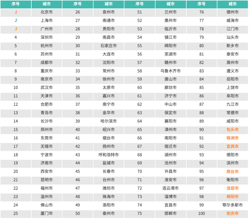 头部城市中,广州、重庆各提升两个位次,苏州提升一个位次,发展优势显著;后发城市位次变动显著,包头、安庆、宜宾、株洲、龙岩、邢台、揭阳新晋数字经济百强,这些城市积极融入数字经济发展大潮,实现从跟跑到并跑的跨越式发展。
