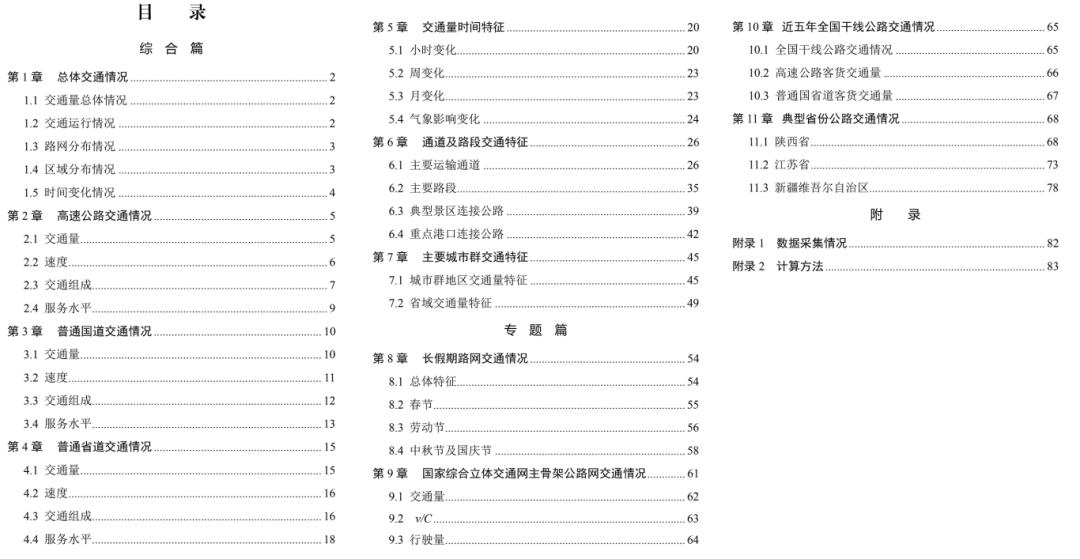 《报告》分为综合篇和专题篇两个专题。综合篇概括了2023年全国干线公路总体交通情况,从路网的空间特性和时间特性两个角度分析了全国干线公路的交通量、速度、交通组成、服务水平、时间特征、路线特征和区域特征等内容。专题篇分析了长假期路网交通情况、国家综合立体交通网主骨架公路网交通情况、近五年全国干线公路交通情况以及陕西、江苏、新疆等典型省份公路交通情况。