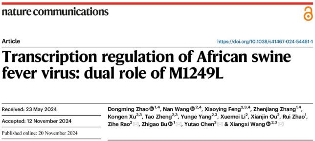 图:非洲猪瘟病毒生命周期中的基因转录调控模型赵东明研究员、王男副研究员、冯孝莹博士研究生和张振江博士后为文章的第一作者,王祥喜研究员、陈瑜涛副研究员、步志高研究员、饶子和院士为文章的通讯作者。