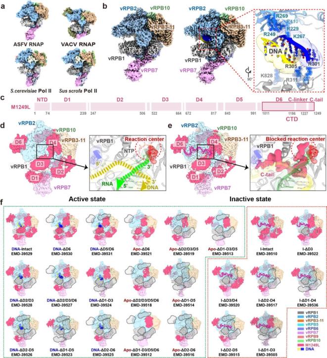 ASFV是已知的唯一大DNA虫媒病毒,与牛痘病毒(VACV)一同被归类为核胞质大DNA病毒(NCLDV)。NCLDVs编码的病毒vRNAP在功能和特异性上与真核生物相似,使它们能在细胞质中进行转录。生物信息学分析显示,ASFV同样编码8个RNA聚合酶亚基以及与真核生物同源的转录因子。然而,由于ASFV的高致病性,关于其基因转录和转录加工酶在病毒组装过程中的实验数据十分有限。本研究利用天然提取的方法,获得了感染状态下ASFV vRNAP的天然构象,并发现了参与病毒转录复合体形成的多功能蛋白M1249L。通过荧光素酶报告系统验证了M1249L的功能,发现其能显著增加vRNAP活性并具有剂量依赖性。此外,研究人员还从冷冻电镜样品数据中,重构出M1249L与vRNAP结合的多种状态,揭示了其在感染过程中的丰富动态性。