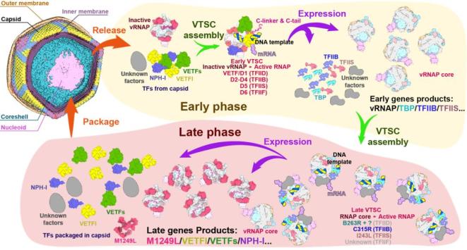 非洲猪瘟是由非洲猪瘟病毒(ASFV)引起的一种猪的烈性传染病,致死率高达100%,对全球畜牧业构成了巨大威胁。ASFV基因组中约20%的基因编码与mRNA转录和修饰相关的蛋白,这种独特的转录机制使ASFV能够在宿主细胞内独立进行基因表达的精确调控。由于缺乏天然的RNA聚合酶复合物机器的结构学信息,ASFV转录机制的具体生物过程、组装和调控机制一直尚未清楚。