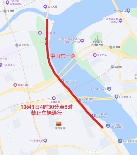 三、2024年12月1日4时30分至8时,中山东一路双向(外白渡桥—东门路)禁止车辆通行。