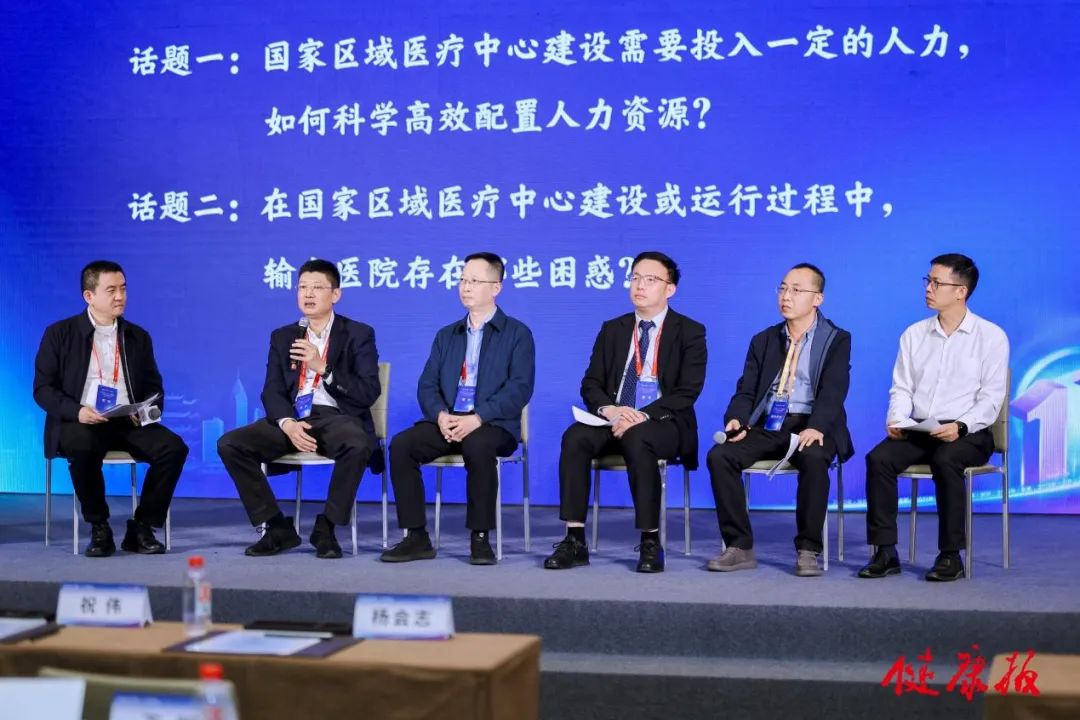 会议的讨论环节由复旦大学附属浦东医院院长李济宇主持,上海交通大学医学院附属瑞金医院海口医院党委书记顾志冬、四川大学华西医院厦门医院副院长聂虎、山东大学齐鲁医院德州医院院办主任王明、西安交通大学第一附属医院榆林医院特聘科长贾涛、广东省人民医院医务处长叶智明围绕“国家区域医疗中心建设过程中,输出医院存在哪些困惑”以及“建设国家区域医疗中心该如何高效配置人力资源”等话题进行了交流和讨论。