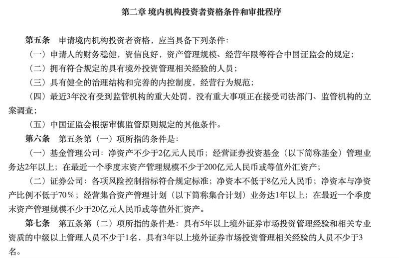 据证监会发布的《合格境内机构投资者境外证券投资管理试行办法》,基金公司要申请QDII资格,需要具备公司财务稳健、有境外管理经验人员、内控完善、三年内未受重大处罚等五大条件。在硬性的管理规模上,基金公司净资产不低于2亿元,最近一个季度末资产管理规模不低于200亿元。