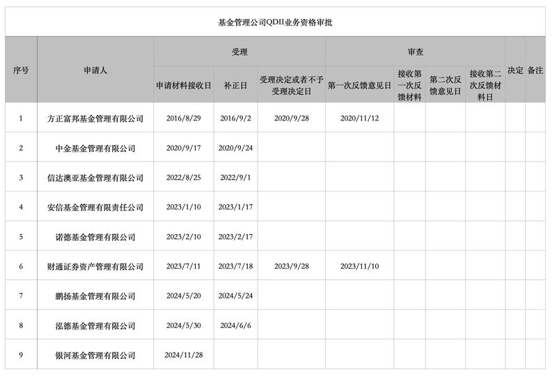 目前,尚在等待QDII业务资格的公募共有9家:2016年提交申请的方正富邦基金,2020年申请的中金基金,2022年申请的信达澳亚基金,2023年申请的安信基金、诺德基金、财通证券资管,以及2024年申请的鹏扬基金、泓德基金、银河基金。