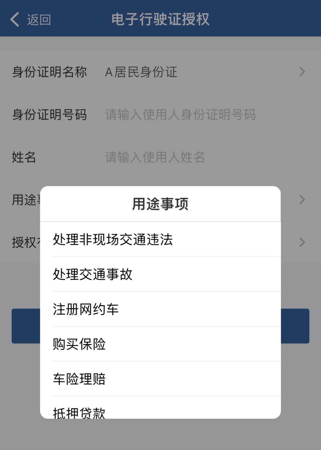 点击电子行驶证下方【授权】按钮进入授权列表,点击页面下方【新增授权】,填写被授权人身份证号、姓名和授权有效期,选择用途事项,提交授权。提交后被授权人电子证件列表中将增加授权电子行驶证列表项,用户可点击显示授权出示的电子行驶证。