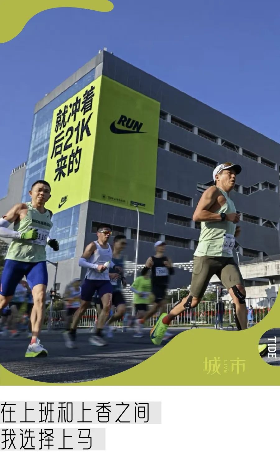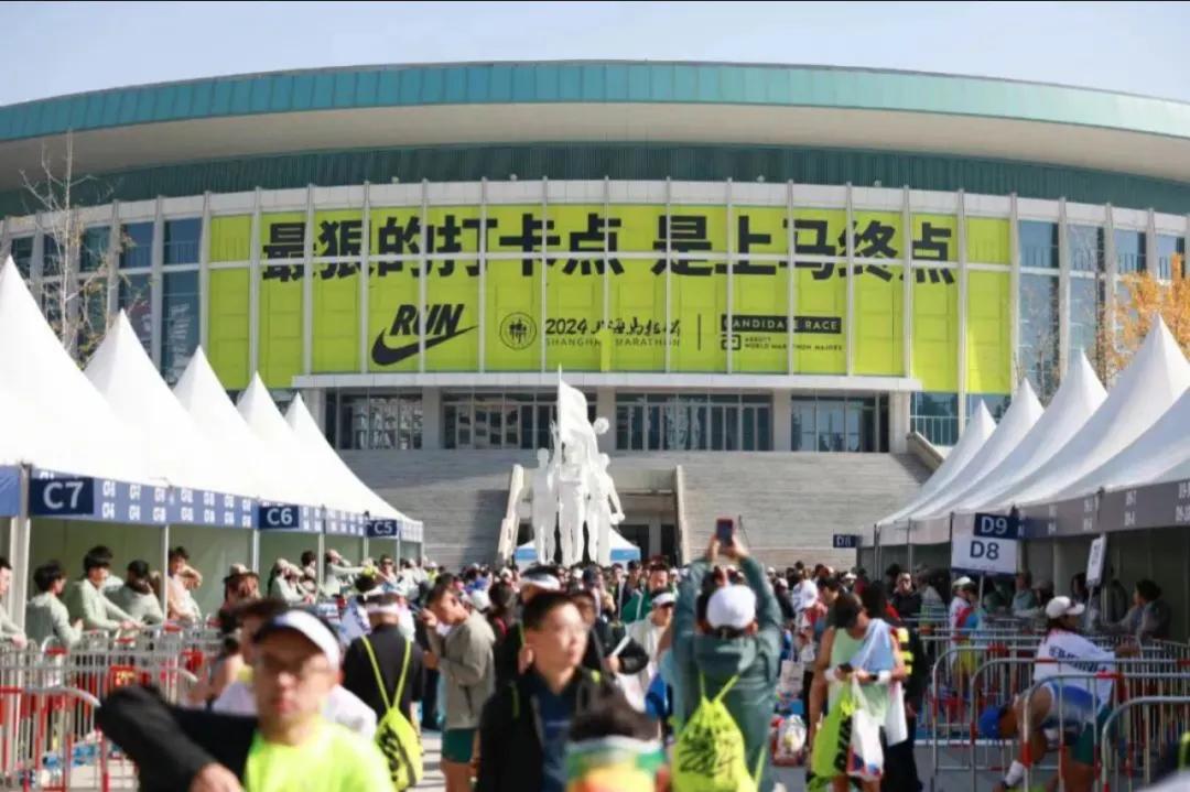 赛道沿途,时常能看到耐克设置的巨幅标语。起点处人头攒动,抬头是醒目的黄底黑字:“征服了千里万里离终点只剩这42.195公里”,而终点则写着“最狠的打卡点,是上马终点”。