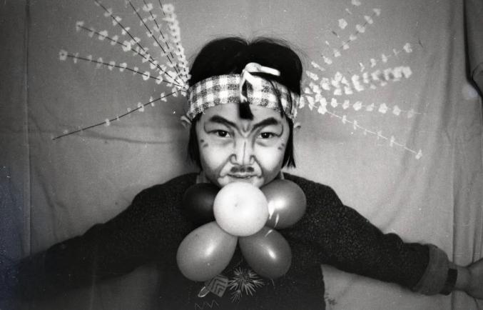 提到家庭影像,它的核心必然是孩子的照片。苏月斫家也不例外。家庭相册就是一部孩子的成长史,一部镶嵌着私人基因密码的视觉史。斫子是他们家一个无比可爱的“麻烦”。父母的宠爱是完全视觉化的,体现在照片反复拍摄妈妈爸爸和孩子的亲吻、拥抱,体现在父母给孩子拍摄正式纪念照中精心的发型和时髦的衣服搭配,体现在十五年来每个生日在同一棵树前的留影……另外,他们家还有自己的独特之处:八九十年代,父母竟然玩起“导演摄影”的大戏。他们极富想象力地给孩子装扮造型,用画笔制成“草裙”、用围巾和羊头的搭配塑造异域女神、画变形的京剧脸谱配气球领花,等等。幼小的孩子是天才的演员,一家人合作的搞怪照片,为庸常的生活创造了无尽的欢愉。这样的摄影游戏在中国家庭影像中稀少而珍贵。