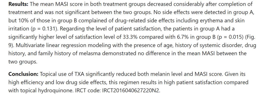 有研究比较了局部使用5%氨甲环酸溶液与2%氢醌的疗效,发现两组实验效果差不多(无统计学意义),甚至使用氨甲环酸那组患者的满意度更高,副作用更少。
