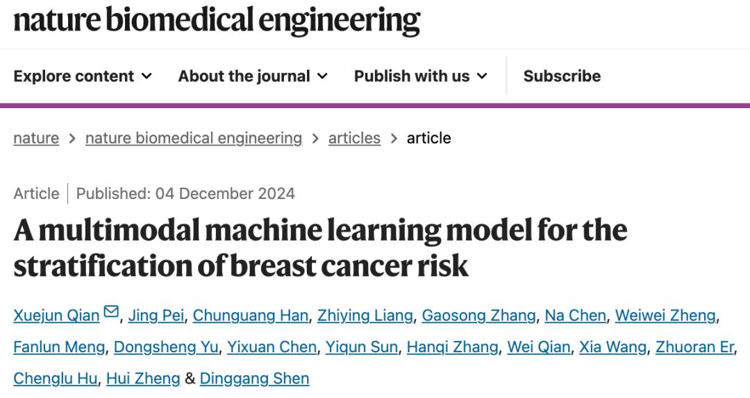 2024年12月4日,上海科技大学生物医学工程学院钱学骏团队在 Nature Biomedical Engineering 期刊发表了题为:A multimodal machine learning model for the stratification of breast cancer risk 的研究论文。