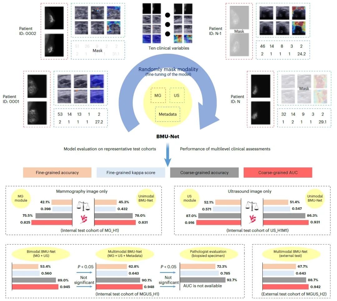 该研究是钱学骏教授团队与安徽医科大学第一附属医院裴静主任团队继2021年在 Nature Biomedical Engineering 上发表的多模态超声乳腺工作后的又一重要进展。再喝祥最新研究中,研究团队开发了一款专门面向乳腺癌风险分层的多模态人工智能系统——BMU-Net模型(图1)。该模型巧妙融合了卷积神经网络在特征提取方面的高效性,以及Transformer在高层特征融合与跨模态整合方面的卓越性能。通过在大规模钼靶和超声数据集上进行迁移学习预训练,再结合多模态匹配数据集进行精细化调优,显著提升了模型的通用性和复用价值。创新性地采用随机掩码训练策略(图2),使BMU-Net能够灵活处理不同模态的输入数据,有效应对临床实践中因患者隐私保护等原因导致的数据缺失问题。