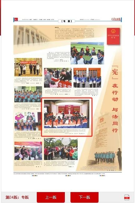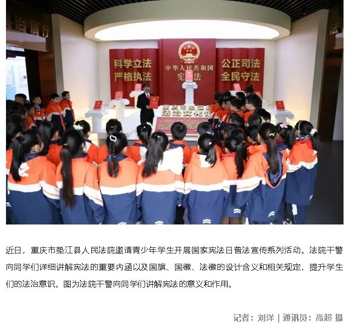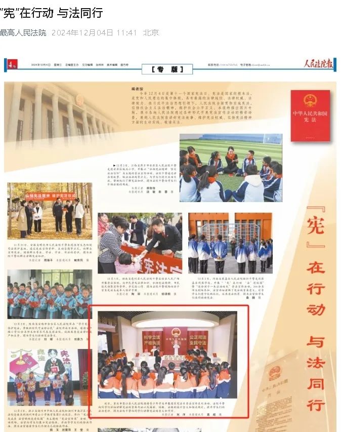 12月4日,人民法院报第4版、最高人民法院微信公众号、重庆法治报第1版聚焦垫江法院开展国家宪法日法治宣传系列活动。编者按 今年12月4日是第十一个国家宪法日。宪法是国家的根本法,是党和人民意志的集中体现,具有最高的法律地位、法律权威、法律效力。在习近平法治思想引领下,人民法院全面贯彻实施宪法,弘扬社会主义法治精神,维护社会公平正义。本报特推出图片专版,展示各地人民法院通过各种形式开展宪法宣传活动的精彩场景,展现人民法院在讲好宪法故事、维护宪法权威、弘扬宪法精神方面的生动实践。敬请关注。