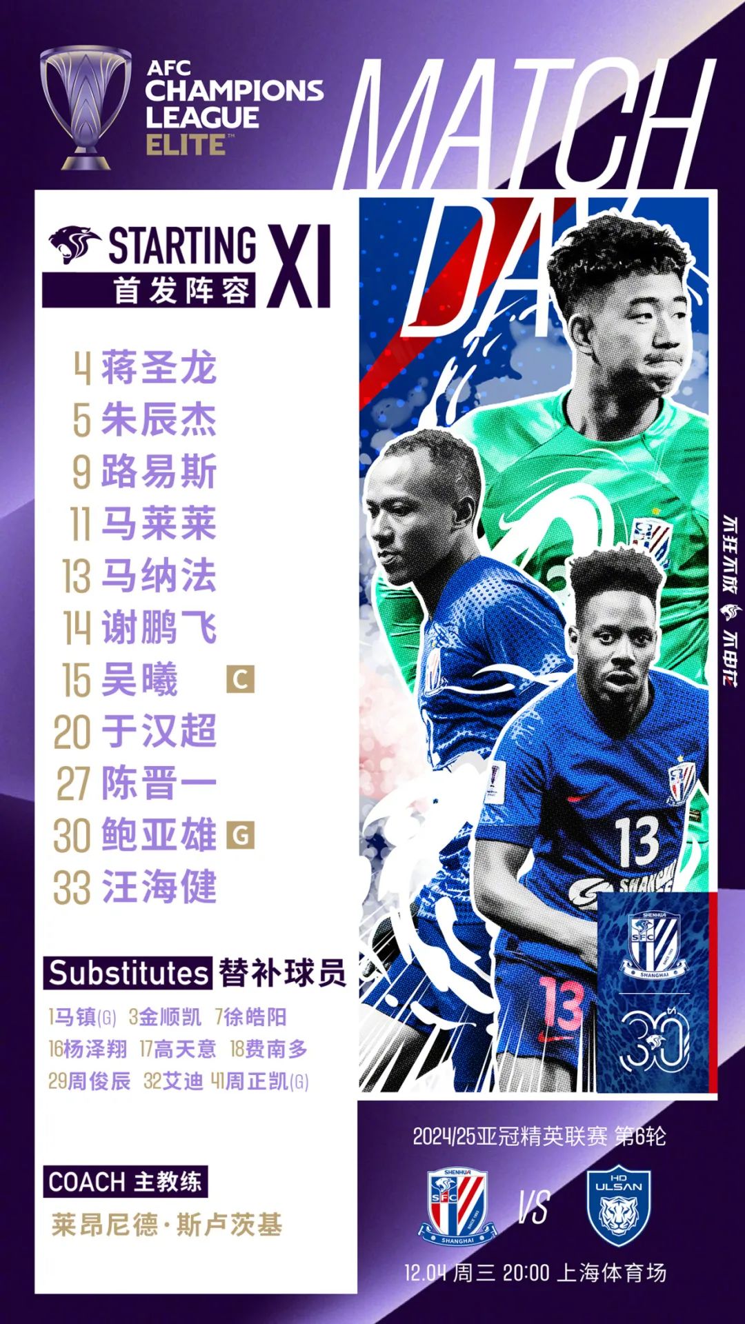 本场比赛,蒋圣龙回归与朱辰杰组成中后卫搭档,陈晋一和重回首发的马纳法分居左右,吴曦、汪海健、于汉超与谢鹏飞组成中场,马莱莱与安德烈·路易斯顶在锋线。徐皓阳、杨泽翔、高天意以及费南多替补席待命,特谢拉累计黄牌停赛未能进入大名单。虽然对手蔚山获得了本赛季K联赛的冠军且获得了2025年世俱杯的参赛资格,但在本赛季亚冠精英联赛,前五战全败的惨淡战绩让他们成为本赛季东亚区唯一一支没有积分的球队。