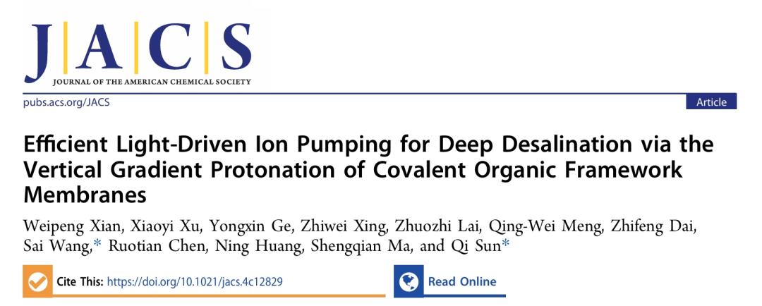 2024年11月28日,浙江大学孙琦研究员团队在Journal of the American Chemical Society期刊发表题为“Efficient Light-Driven Ion Pumping for Deep Desalination via the Vertical Gradient Protonation of Covalent Organic Framework Membranes”的研究论文,团队成员县维鹏为论文第一作者,浙江大学博士后王赛(现浙江师范大学青年教师)、孙琦研究员为论文共同通讯作者。