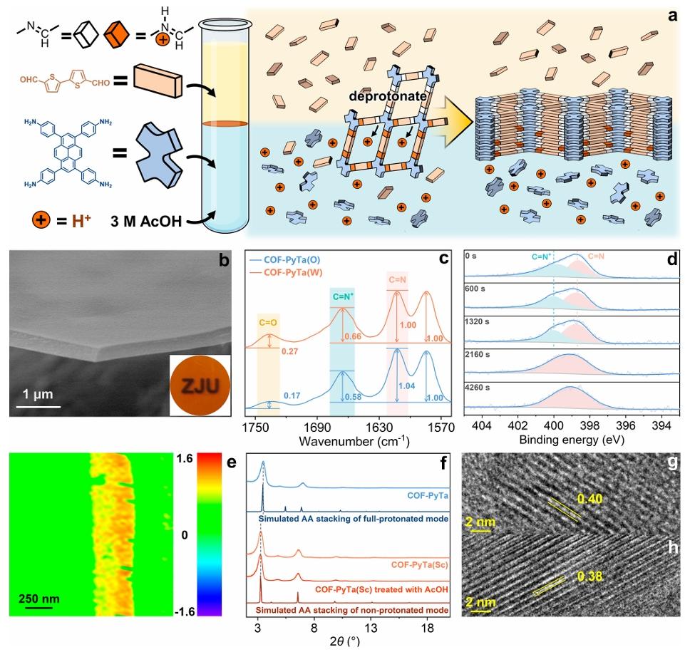 图1. 膜的合成和表征。(a) 酸催化的液-液界面聚合示意图,用于在跨膜的亚胺键中产生质子化的垂直梯度(垂直于膜平面)。(b) COF-PyTa膜的SEM图像;插图为膜的照片。(c) 比较COF-PyTa(O)和COF-PyTa(W)的ATR-FTIR光谱。(d) 从COF-PyTa(W)侧到COF-PyTa(O)侧,经过不同时间的Ar+连续蚀刻后,COF-PyTa膜的XPS光谱。(e) 1665 cm-1处的AFM-IR强度图,显示了膜截面上的分布。(f) 显示晶体结构变化的PXRD图。(g,h) COF-PyTa和COF-PyTa(Sc)的TEM图像。