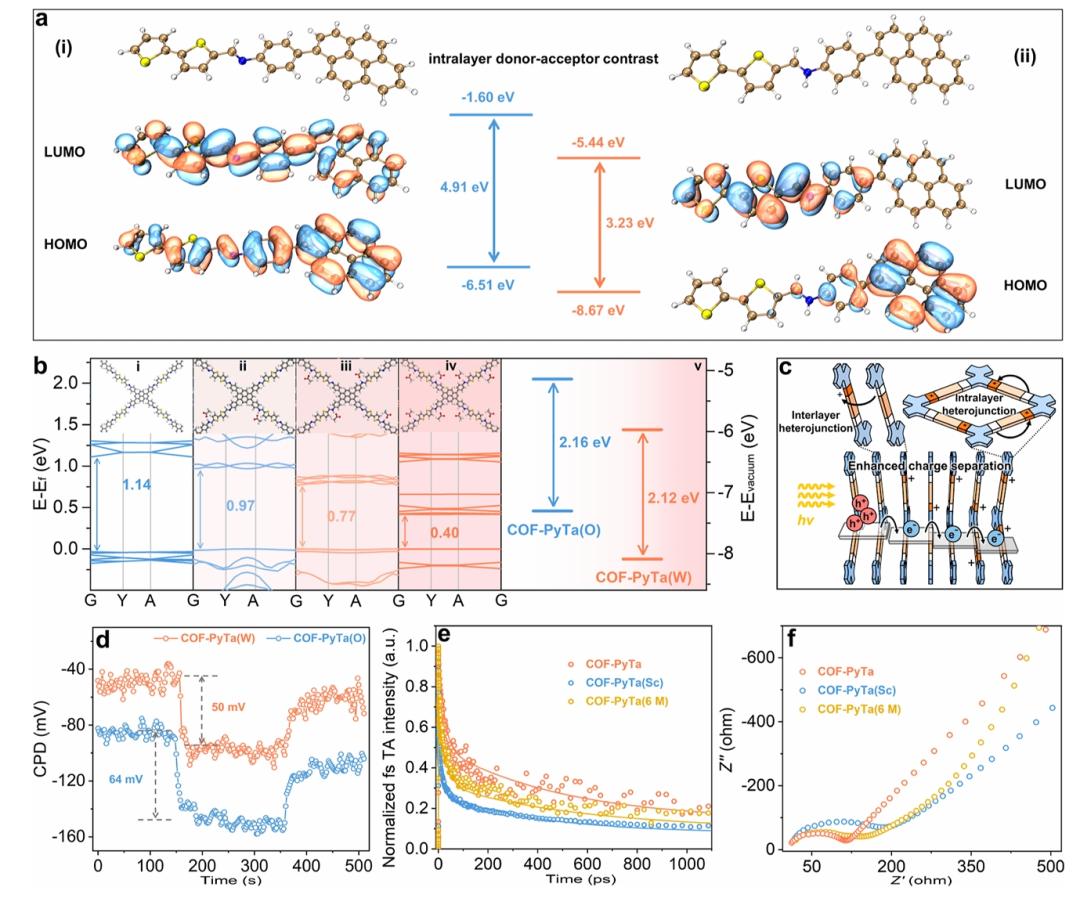 图2. 光学特性分析。(a) COF-PyTa的(i) 非质子化片段和(ii) 质子化片段的NTO粒子空穴图,说明电子分布变化(金;C,蓝色;N,黄色;S和白色;H)。(b) 不同质子化水平的亚胺键能带结构演化:(i) 非质子化,(ii) 1/4质子化,(iii) 1/2质子化,(iv) 完全质子化,包括(v) COF-PyTa(W)和COF-PyTa(O)之间的能级排列差异。(c) 增强电荷分离的层内和层间异质结构示意图。(d) 黑暗和400nm光照下COF-PyTa(W)和COF-PyTa(O)的CPD测量。(e) COF-PyTa, COF-PyTa(Sc)和COF-PyTa(6 M)在激发峰(690, 698和680 nm)的飞秒分辨率的TA动力学,显示平均弛豫寿命。(f) 黑暗中的EIS Nyquist图。