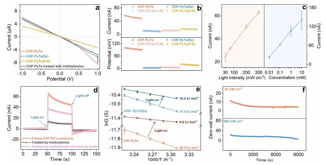 图3. 光驱动离子输运的评估。(a) 对称1mM KCl溶液的I-V曲线。(b) 在功率密度为200 mW cm-2的氙灯和0.1 mM氯化钾溶液下,光驱动离子在不同类型膜上输运的性能比较。(c) 电流振幅对光强和氯化钾浓度的依赖性:0.1 mM氯化钾溶液在不同光强下的电流测量(左)和300 mW cm-2恒定照明下不同氯化钾浓度下的电流测量(右)。(d) 不同处理前后COF-PyTa膜在黑暗和光照(200 mW cm-2)条件下的I-t轨迹。(e) 光照射前后离子通过膜的活化能变化。(f) COF-PyTa膜中光驱动离子传输的长期稳定性,使用对称的0.5 mM氯化钾溶液进行评估。